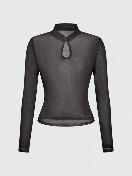 ROMWE Avant Blusa de manga larga con cuello Mao, estampado de Buda, estilo vintage chino, ceñida y transparente, sexy para mujer