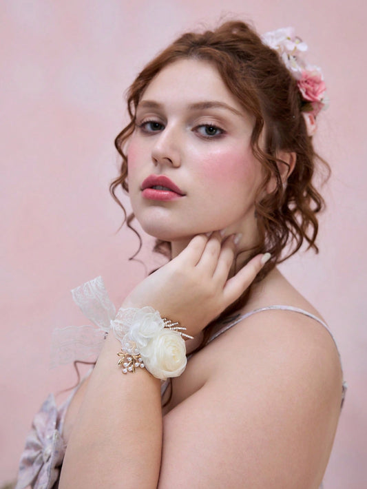 ROMWE Kawaii 1 pieza Pulsera con elementos de perla de rosa de estilo palaciego, pulsera elegante de alta gama con lazo de encaje de strass, pulsera versátil, de alta gama y elegante