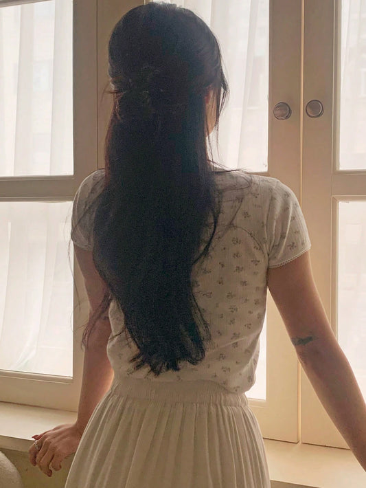 DAZY Camiseta ajustada corta de estilo minimalista casual con estampado floral difuso para mujer, top corto para mujer
