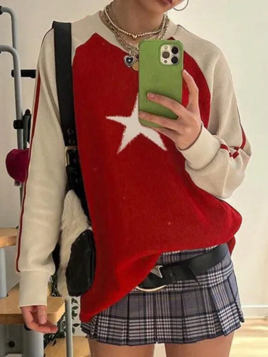 INAWLY Sudadera de cuello redondo casual de mujer con estampado de estrella de color contrastante, para primavera/otoño