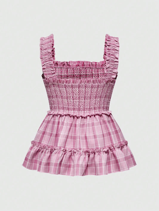 ROMWE Camiseta sin mangas a cuadros retro dulce y picante para mujer