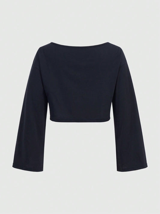 Elenzga Camiseta de manga larga minimalista con decoración de lazo para mujer, casual para uso diario en primavera