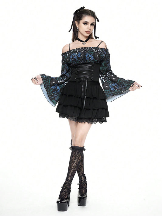 ROMWE Goth Blusa de mujer con estampado de sol, luna y flores con cintura con cordón y mangas acampanadas