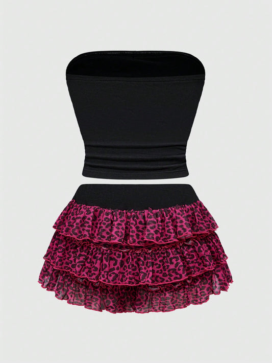 ROMWE Kawaii Conjunto de 2 piezas de mujer con estampado de leopardo sexy Shibuya 3D y lazo de punto