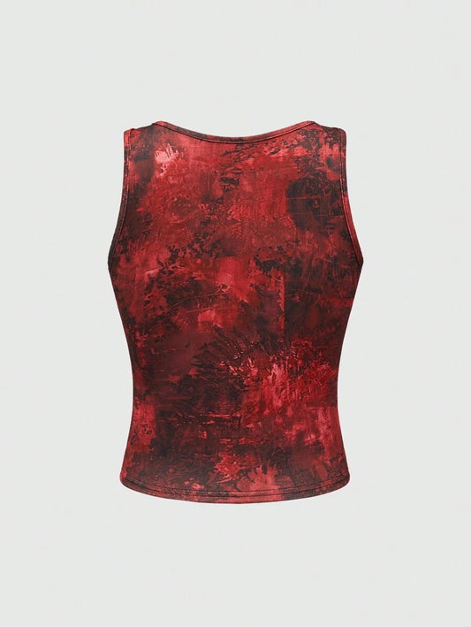 ROMWE Grunge Punk Camiseta sin mangas punk con diseño anudado teñido y estampado de ojos negros misteriosos para chicas callejeras mujer