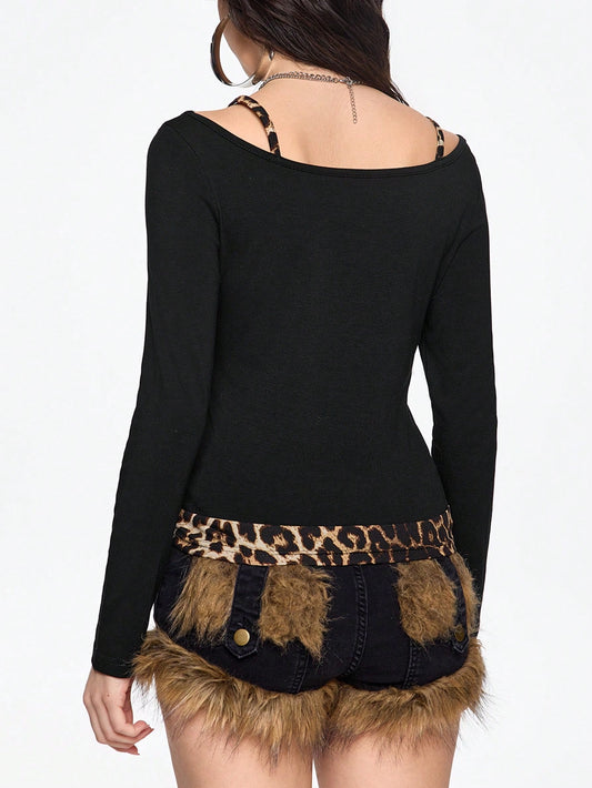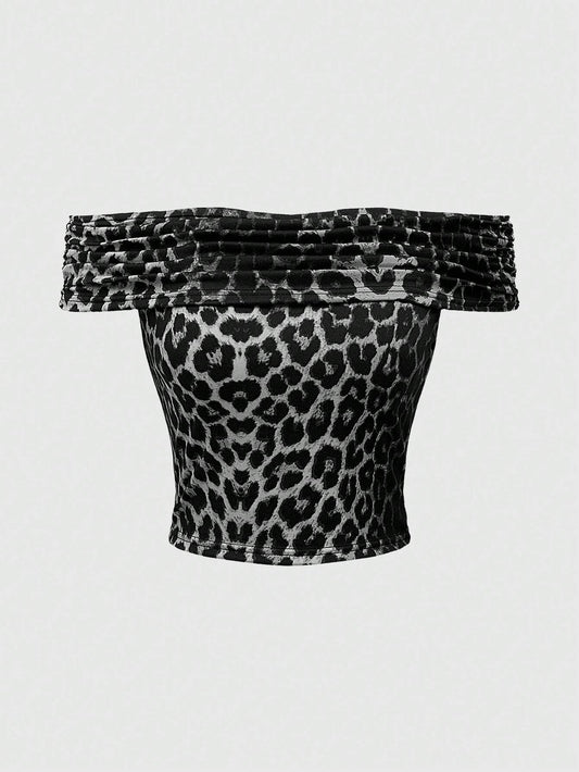ROMWE Grunge Punk Camiseta para mujer ajustada con hombros descubiertos y estampado de leopardo - Tendencia retrospectiva del milenio, escuela