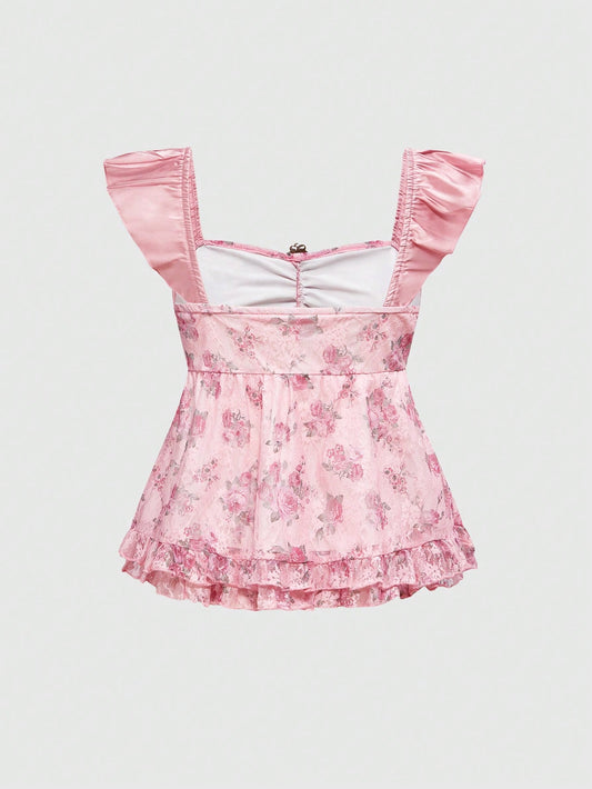 ROMWE Hippie 1 pieza Camiseta ajustada para mujer con estampado floral, volantes en el busto, hebilla y dobladillo asimétrico
