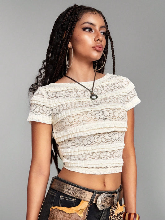 ROMWE Hippie Camiseta con encaje de contraste bordada, estilo hippie de la era Y2K, para vacaciones