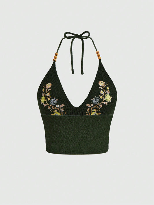ROMWE Hippie Top de punto halter sin espalda con bordado floral