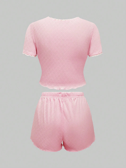 ROMWE Kawaii Conjunto de pijama de mujer con encaje de punto hueco y lazo romántico y encantador en forma de corazón