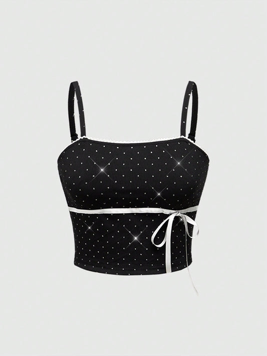 ROMWE Kawaii Conjunto de pijama de verano para mujer con pantalones cortos de tirantes finos, decorado con parches de encaje floral y lazo