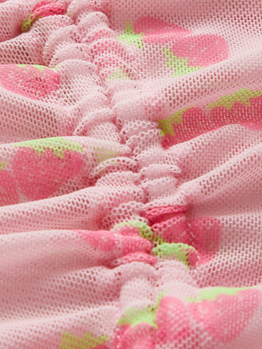 ROMWE Kawaii Conjunto de ropa de dormir de tirantes con volantes con diseño de fresa y moño para mujer, de uso casual en verano