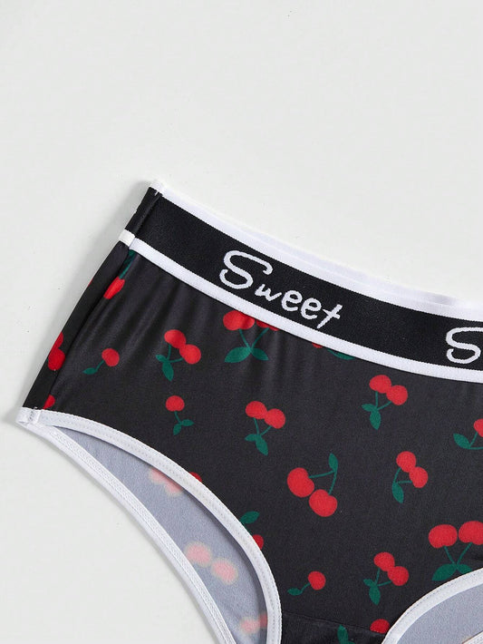 ROMWE Kawaii Conjunto de 3 piezas Tanga con estampado todo sobre de letras dulces con adornos con estampado de fresa y cereza