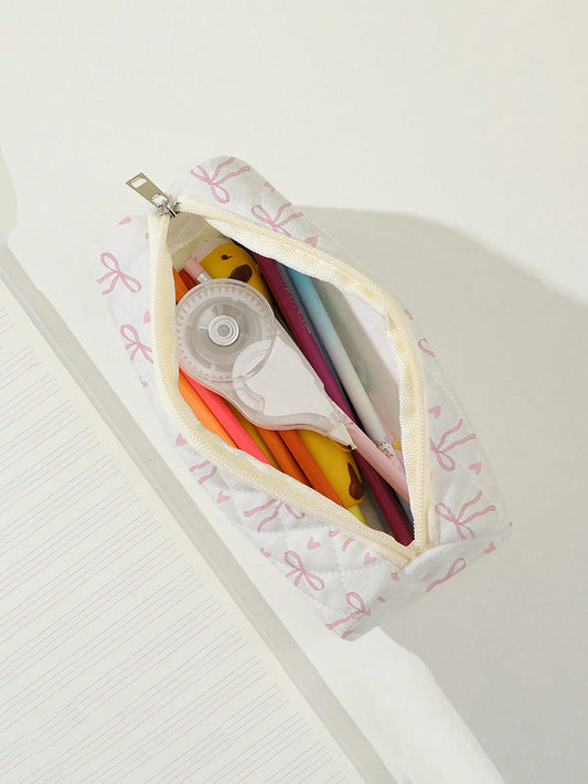 ROMWE Kawaii Estuche para lápices con diseño de moño y estampado de corazón, bolsa de cosméticos con diseño de rombo, estuche con cremallera, monedero, caja de papelería, adecuado para bolígrafos y útiles escolares