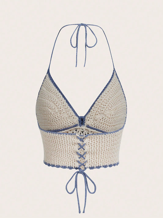 ROMWE Kawaii Parte superior de punto con atadura delantera de encaje a contraste, para vacaciones en la playa, escuela