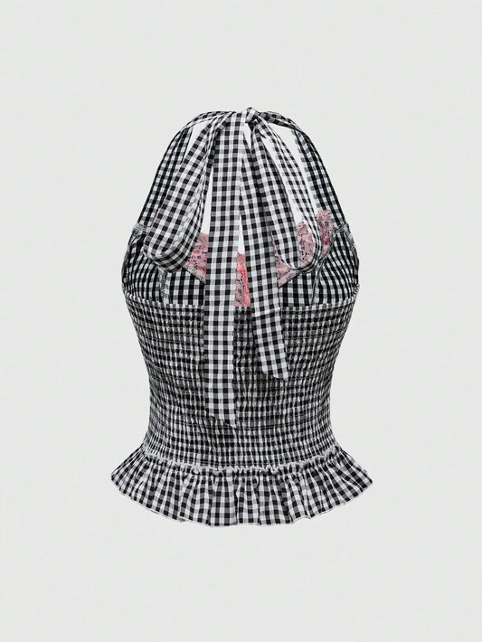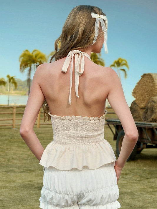 ROMWE Kawaii Top de mujer tipo halter de estilo vintage casual con volantes, cintura ceñida y decoración de lazo minimalista y sexy