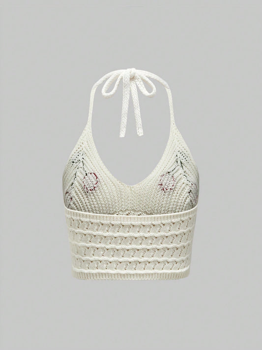 ROMWE Kawaii Top De Punto Para Mujeres Con Estampado Dulce De Cereza Bordado En La Parte Superior, Con Correas De Atar Estilo Halter