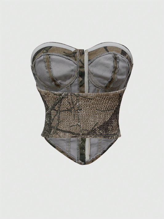 ROMWE Kawaii Top de tirantes acortado de mezclilla desgastada con estampado de camuflaje sexy para mujer, estilo streetwear Y2K