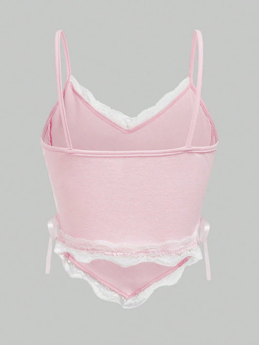ROMWE Kawaii Top tejido de tirantes unicolor puntillas con encaje en contraste