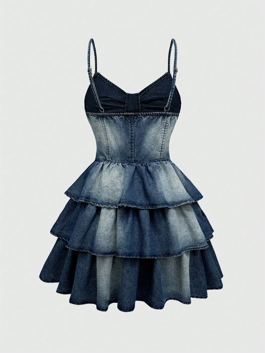 ROMWE Kawaii Vestido de mezclilla con capas tipo pastel con lazo, vestido sin mangas de color liso y adorable, para la escuela