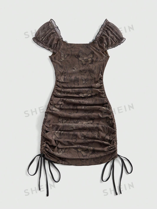 ROMWE Vestido de dibujo de mariposa vintage de verano para mujer, con detalles de contraste de encaje lateral y cordón ajustable
