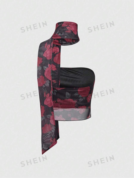 ROMWE Top sin tirantes para damas con diseño de rosa y cinta
