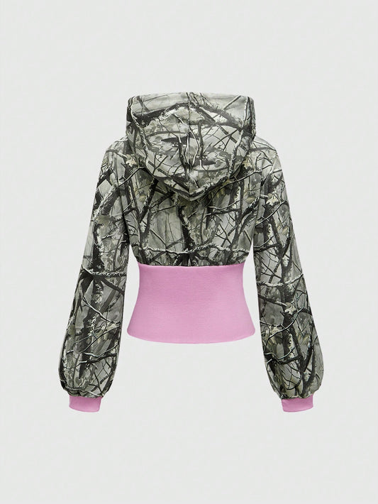 ROMWE Street Life Sudadera con capucha de cintura alta con cordón, colorblocking y gráfico de rama, estilo streetwear Y2K para mujer
