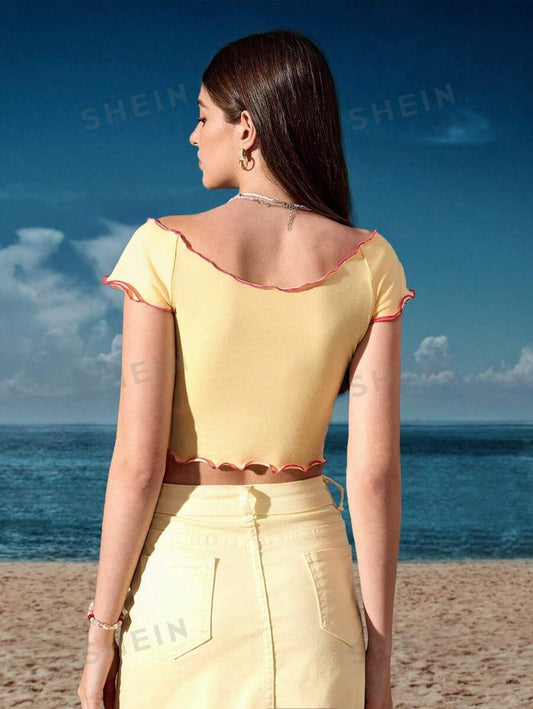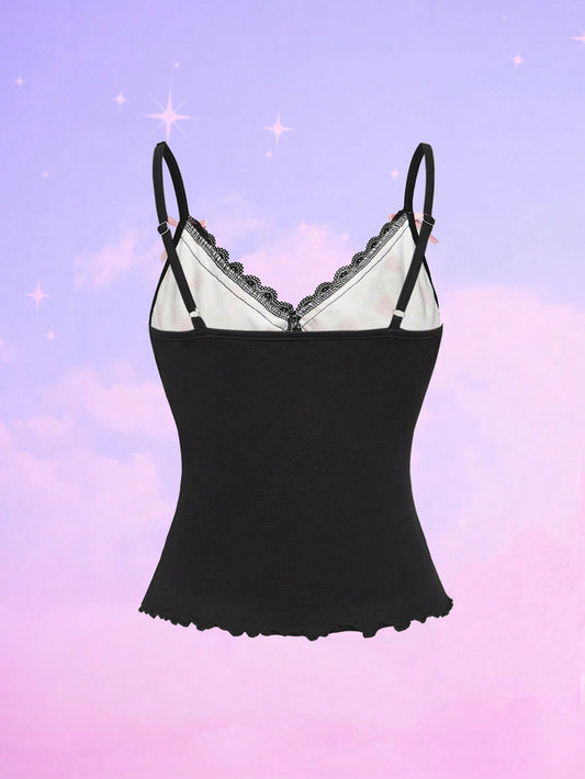 ROMWE X Care Bears Top camiseta ajustada para mujer con estampado de oso de dibujos animados y corazones, con lazo decorativo y ribete de lechuga, para el verano