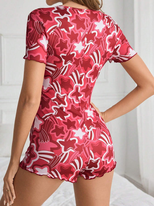 Ropa de dormir de mameluco para mujer con estampado de estrellas, ribete de encaje y mangas cortas, verano