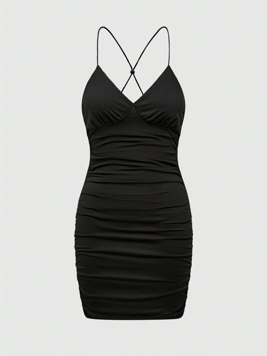 ROMWE Vestido de mujer sexy ajustado con pliegues, sin espalda y corbata de mariposa