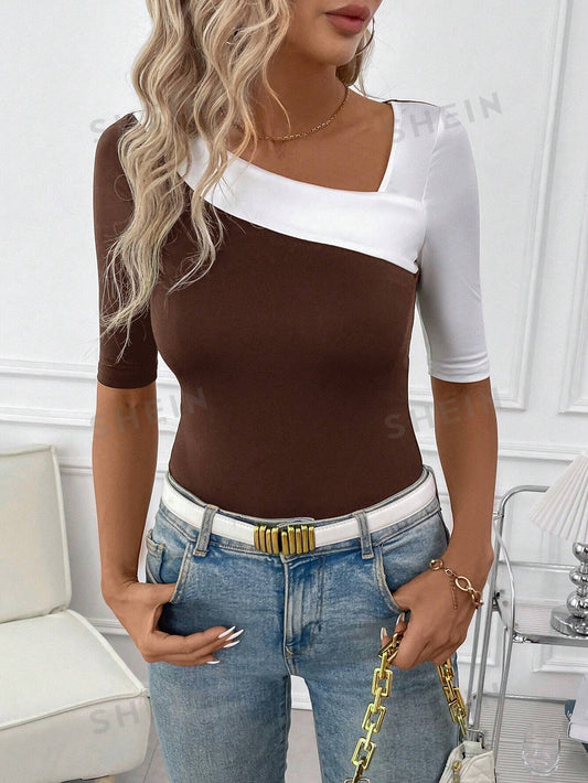 SHEIN Clasi Camiseta ajustada de manga corta con cuello asimétrico y bloques de color para mujer, ideal para el verano