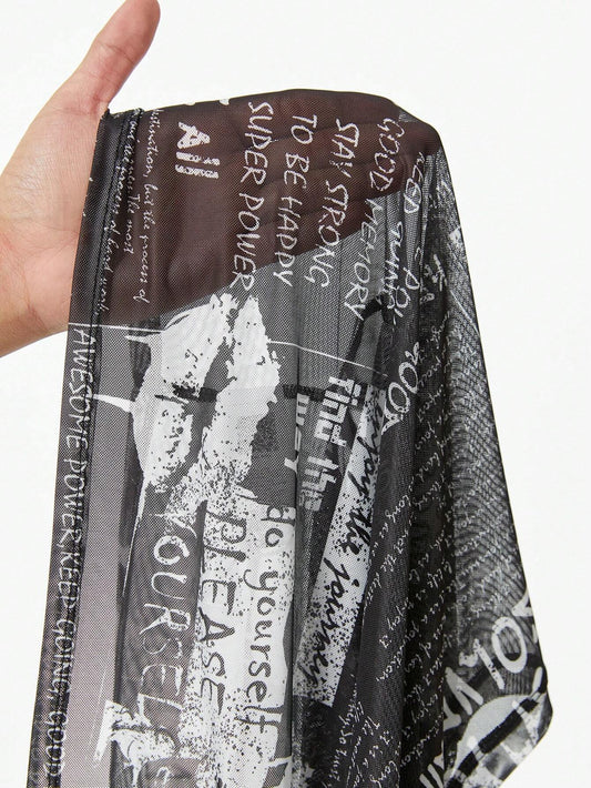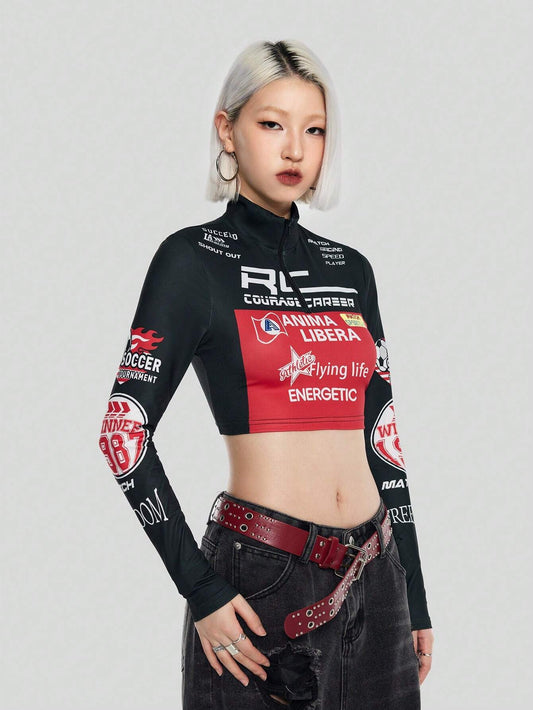 SHEIN Coolane Top De Manga Larga Con Cuello Medio Abierto Y Cremallera Estampada