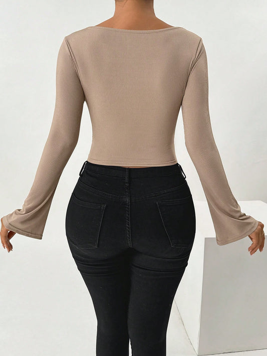 SHEIN Essnce Camiseta de manga larga de punto ajustada con cuello cuadrado de unicolor para mujer, primavera-verano