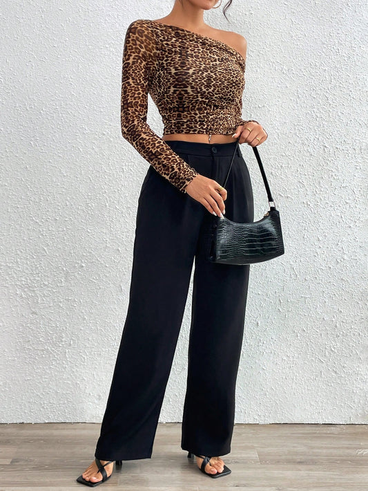 SHEIN Essnce Camiseta elegante de manga larga con cuello asimétrico y estampado de leopardo ajustada para mujeres