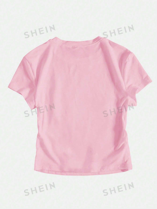 SHEIN EZwear Camiseta casual para mujer con cuello redondo, manga corta y ajuste entallado con estampado de letras y personajes