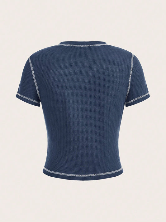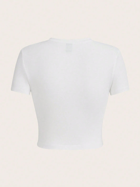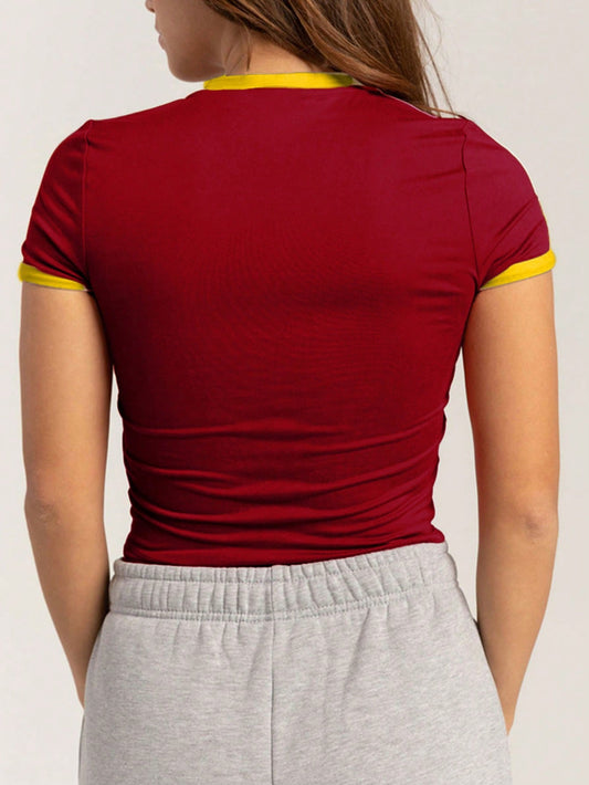 SHEIN EZwear Camiseta corta de mujer de corte ajustado con un diseño minimalista de patrón contrastante en el cuello y los puños