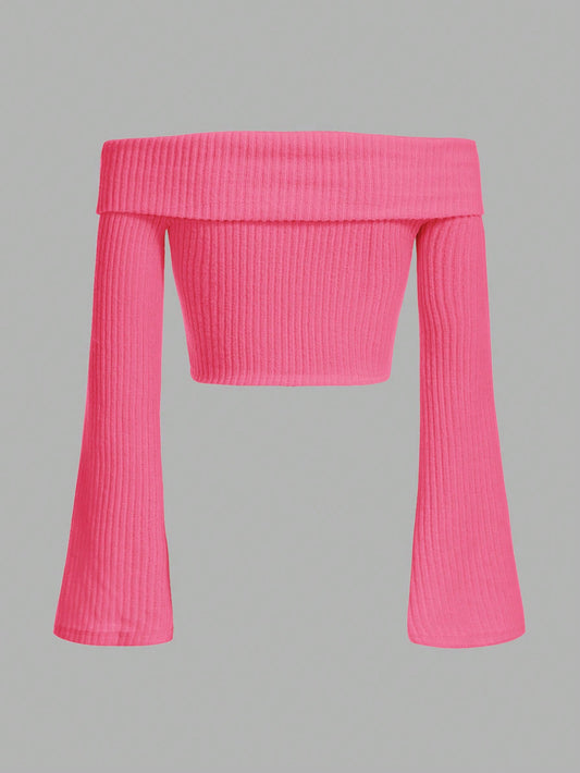 SHEIN EZwear Camiseta crop doblado de hombros descubiertos de manga campana