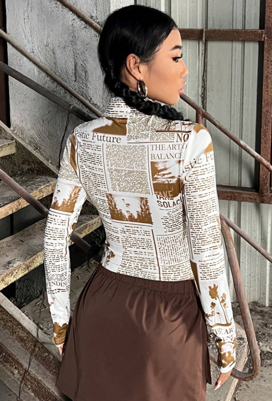 SHEIN EZwear Camiseta crop con estampado de periódico de cuello alto