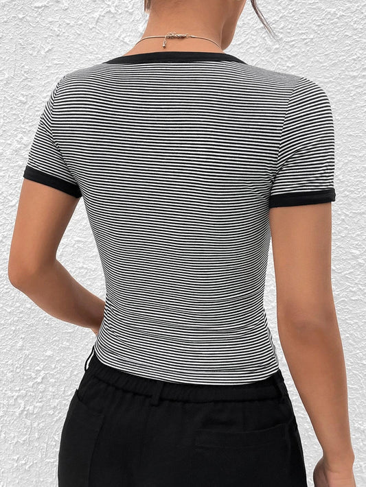 SHEIN EZwear Camiseta crop de rayas de cuello notch ribete en forma de lechuga