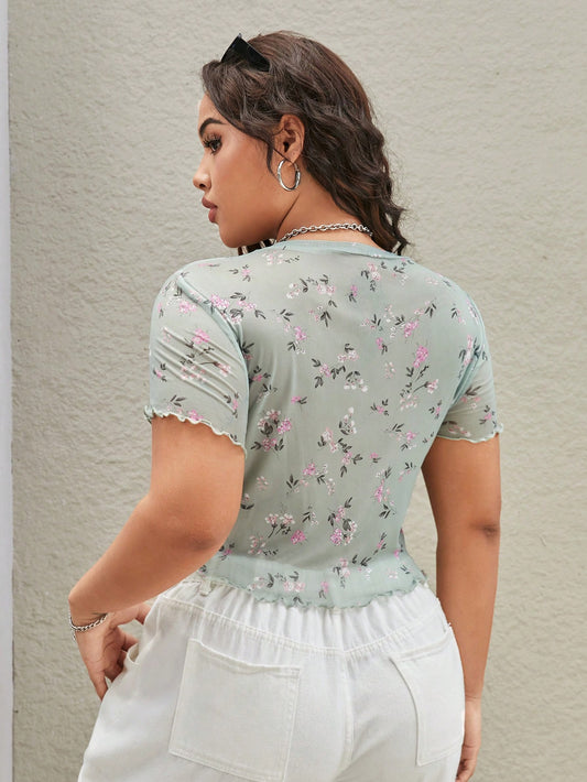 SHEIN EZwear Camiseta de manga corta de malla transparente con estampado floral morado Ditsy, dobladillo con borde ondulado y corte ajustado para mujeres de talla grande para las vacaciones de verano