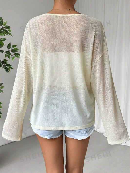 SHEIN EZwear Camiseta transparente de manga larga con cuello redondo y hombros caídos sueltos de unicolor para primavera/verano de mujer