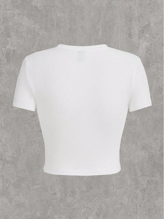 SHEIN EZwear Camiseta de verano ajustada y corta con cuello redondo y manga corta con estampado de araña casual para mujeres