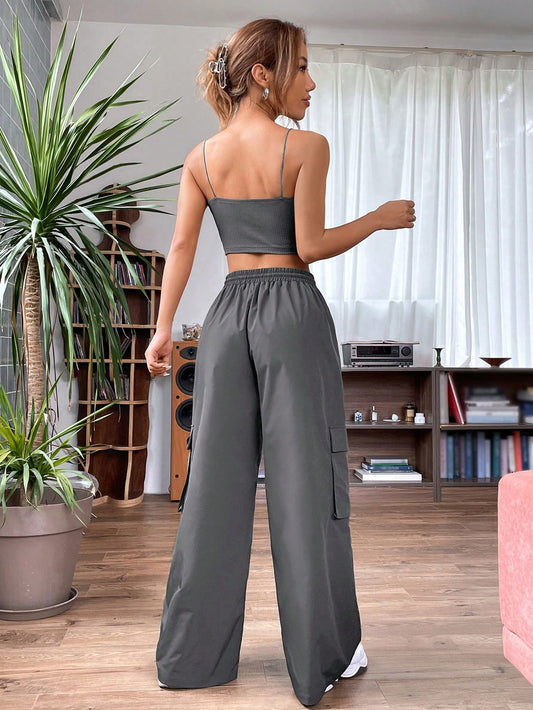 SHEIN EZwear Conjunto informal de top de punto sin mangas y pantalones cargo con diseño de bolsillo tejido para primavera / verano