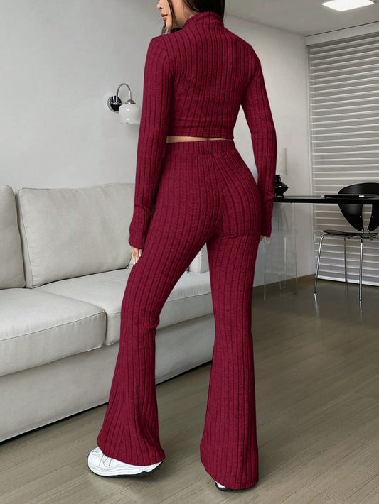 SHEIN EZwear Conjunto de 2 piezas con top de sudadera con capucha de punto roja y pantalones ceñidos con campana para mujer