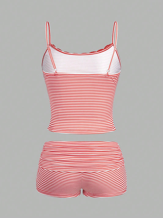 SHEIN EZwear Conjunto de 2 piezas con top de tirantes y shorts con detalle de encaje para mujer