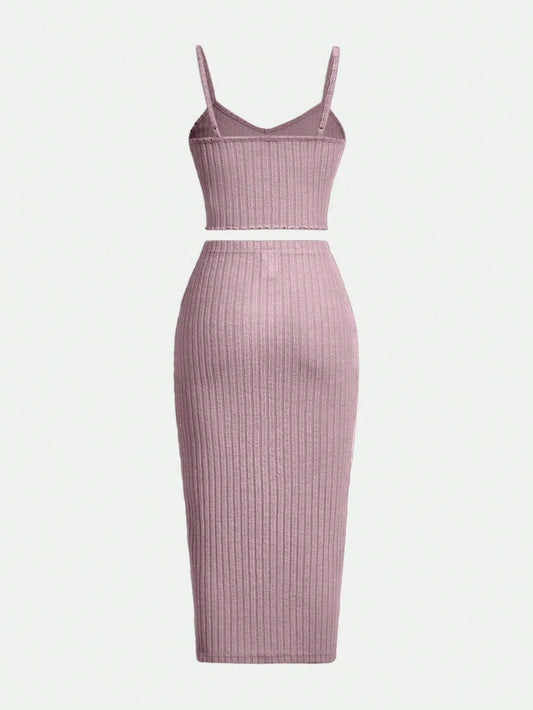 SHEIN EZwear Conjunto de chaleco de camisola ajustada y falda de media Body de punto acanalado para mujer en tono lavanda