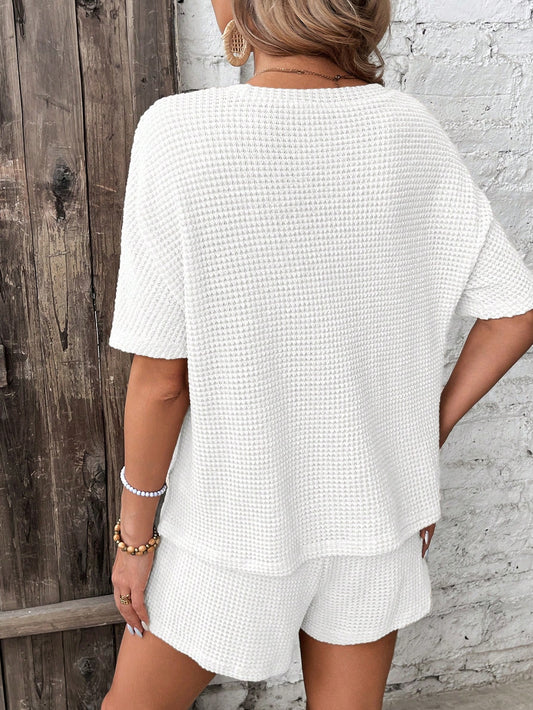 SHEIN Frenchy Conjunto De Dos Piezas Para Mujeres Con Camisa De Cuello Redondo De Tela Texturada Y Pantalones Cortos Con Cinturón, Todo En Color Sólido Y Estilo Informal