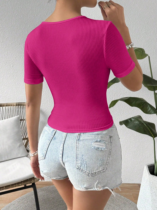 SHEIN Frenchy Camiseta de manga corta entallada para mujer de verano con botones de media tapeta y unicolor