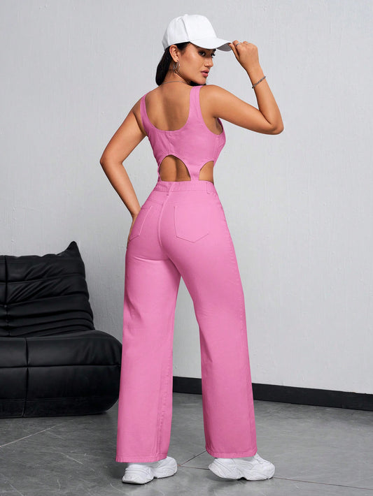 SHEIN ICON Overol de mezclilla de verano unicolor para mujer con moda hueca hacia afuera