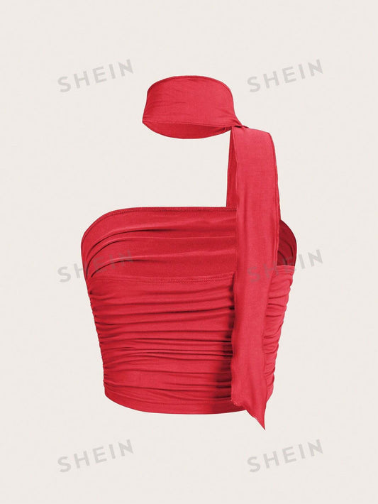 SHEIN ICON Top crop de un hombro fruncido detalle ribete con fruncido rosetón 3D
